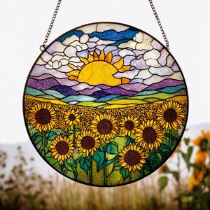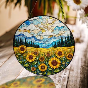 sunflower field mountain landscape suncatcher vibrant glass window decor gift for mom