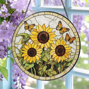 Sunflower Stained Glass Suncatcher: Butterfly Sunflowers Window Hanging, Gift for Mom Grandma