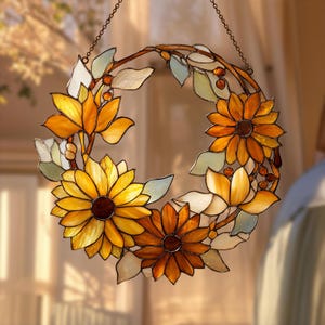 Sunflower Magnolia Wreath Stained Glass Suncatcher, Rustic Floral Window Hanging Decor, Fall Farmhouse Gift